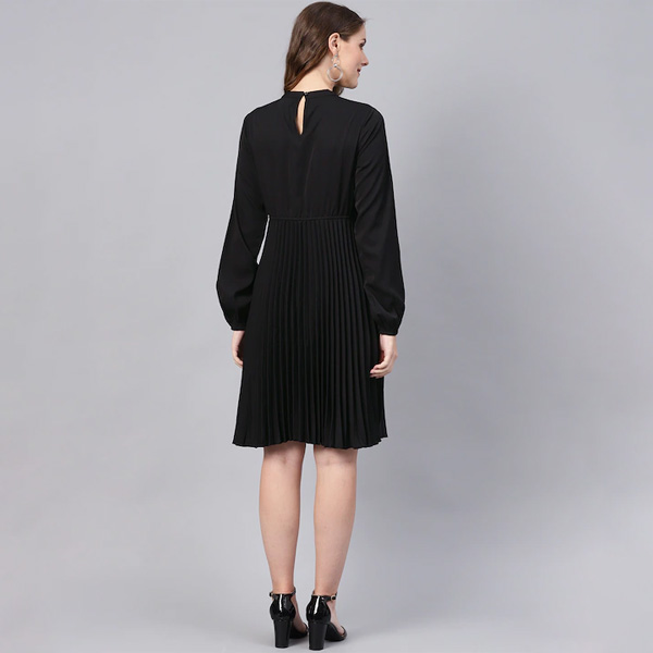 Black solid woven accordian pleats empire dress, has a stand collar, long puff sleeves, button closure, flared hem