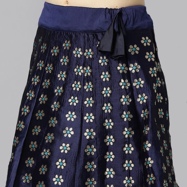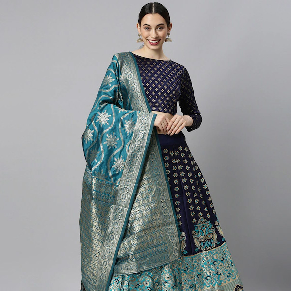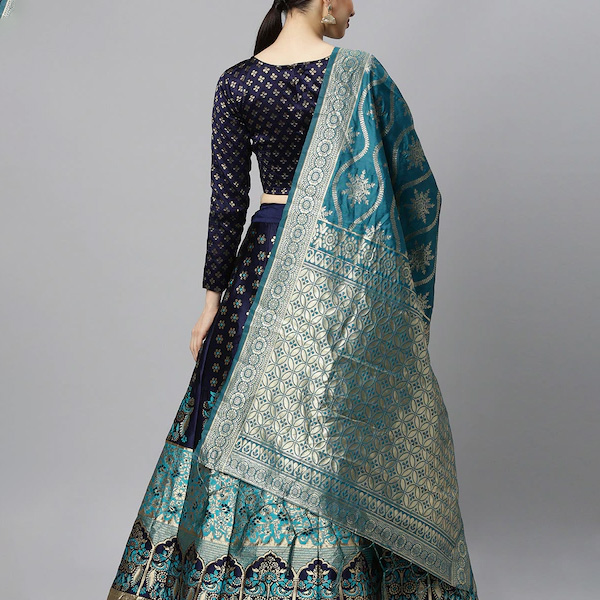 Blue and green woven design lehenga choli with dupatta,Blue and green woven design unstitched blouse, has a round neck, long sleeves, flared hem. Blue and green woven design dupatta, tassels border