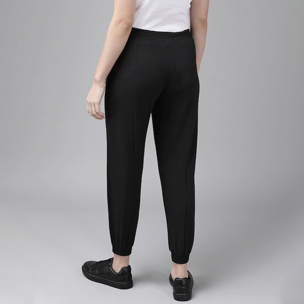 Black solid mid-rise cropped joggers, has an elasticated waistband with drawstring closure, two pockets, cuffed hem