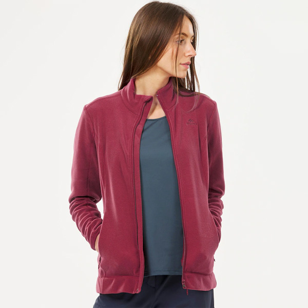 Red Solid Polyester Hiking Fleece Jacket, has a mock collar, 2 kangaroo pockets, zip closure, striaght closure, polyester lining fabric